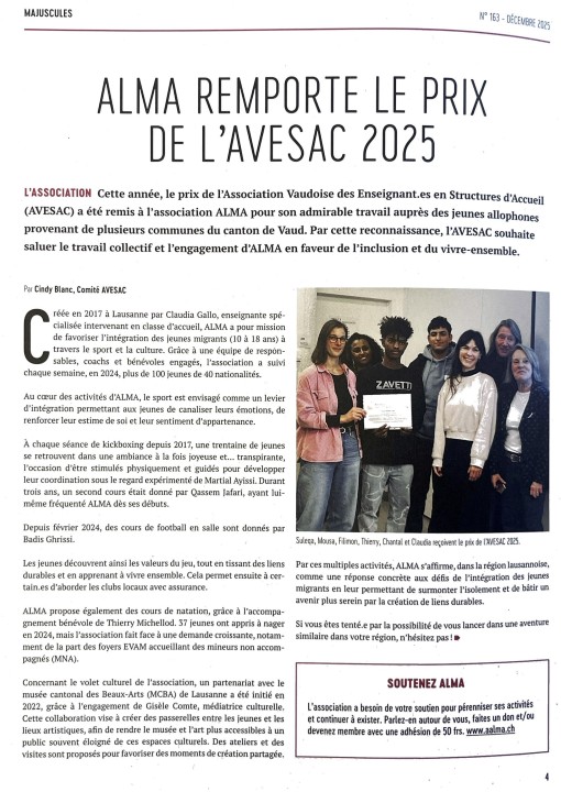 L’association Alma, fondée en juillet 2017, a pour mission d’apporter un accompagnement et un soutien aux jeunes migrants mineurs par la création de lien social à travers des activités sportives et culturelles, afin de leur offrir un lieu d'échange bienveillant et favoriser ainsi leur intégration. Alma c'est bien plus que les activités en elles-mêmes!
